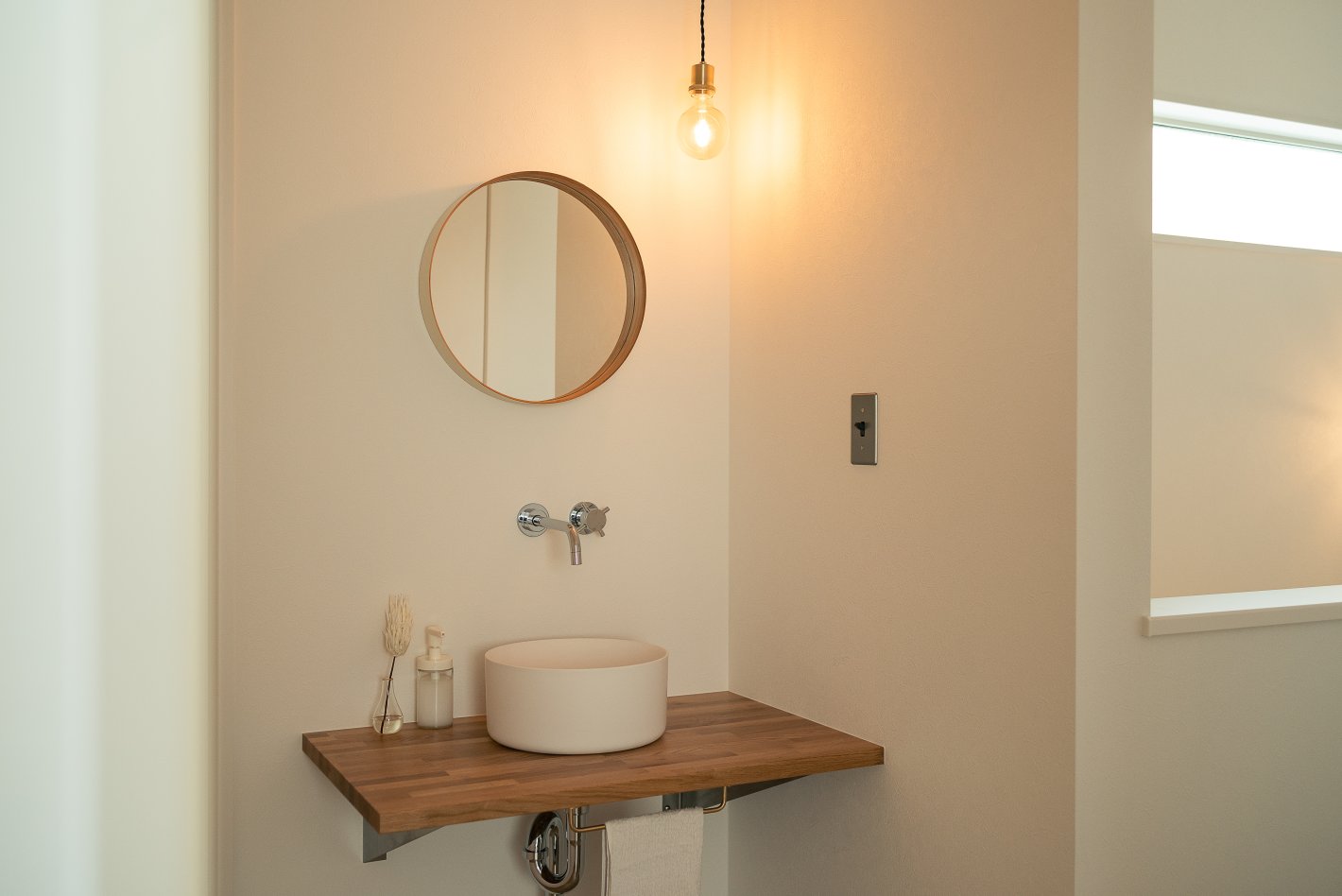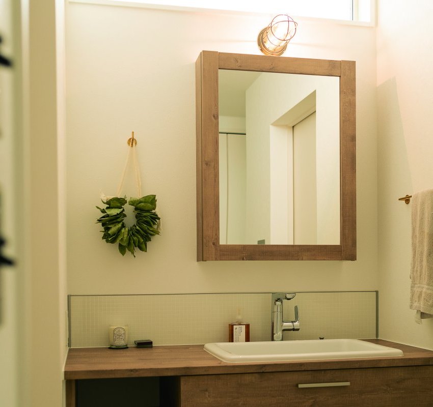 当初1階の洗面台も造作を考えていましたが、デザイン、コスト、機能性を勘案して既製品を選択しました。 -