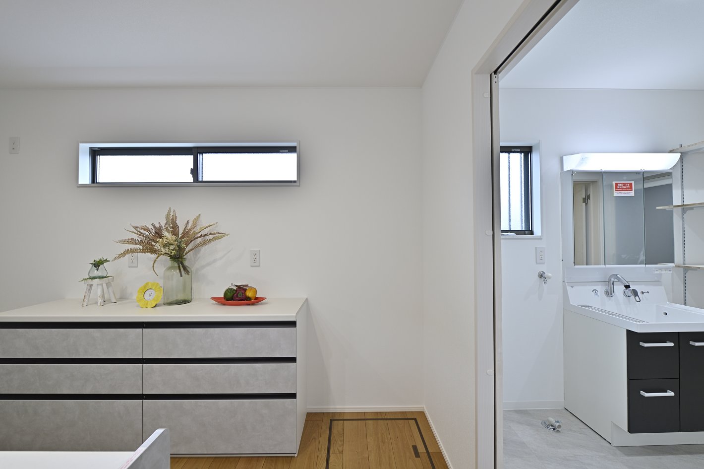 洗面脱衣室は玄関からもキッチンからも行き来できる回遊動線になっています。