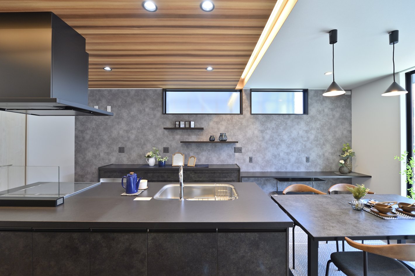 お部屋全体の雰囲気に合わせて、キッチンはブラックのセラミック材を採用し、扉のカラーも黒いスタイリッシュなデザインにしました。