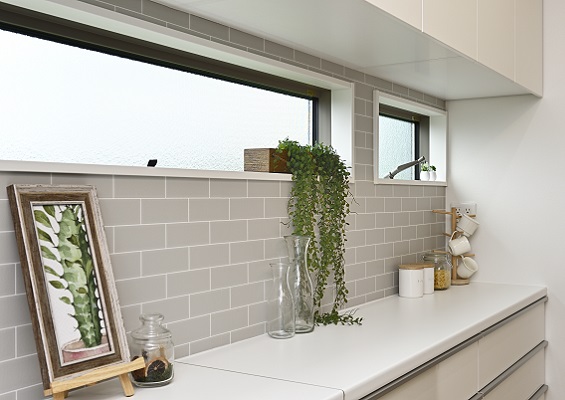 キッチンの背面には、奥さまに人気のグレーのタイル柄クロスを採用。おしゃれなデザインで、友人にも自慢したくなるキッチンです。