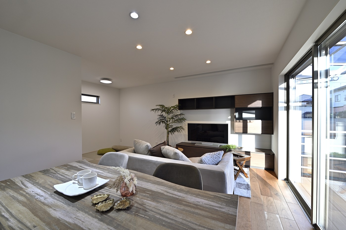 日中は太陽の光に包まれ、夜はやわらかな照明に照らされる、心地よいリビングに仕上げました。