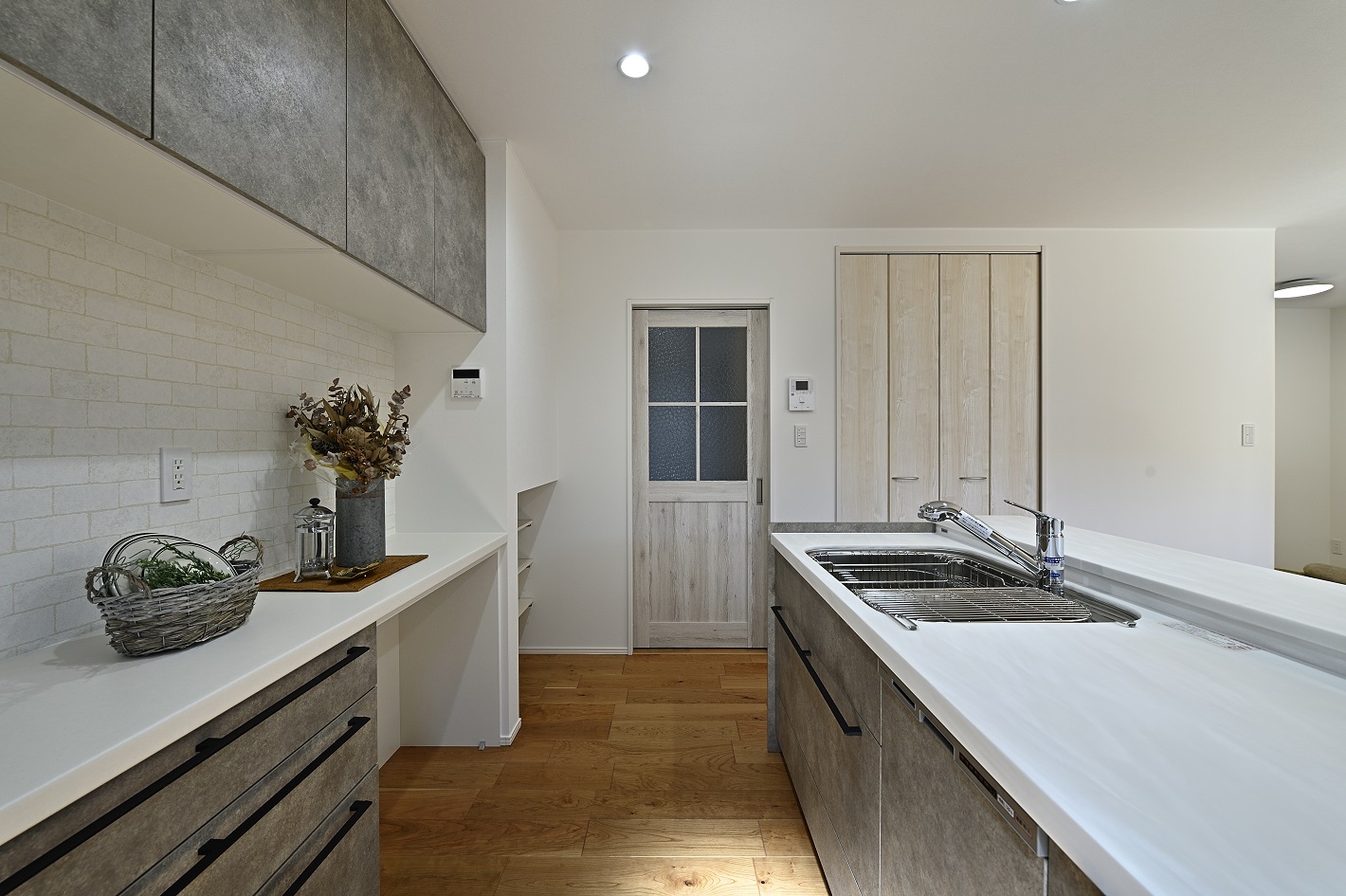 ワークトップは人気の「コーリアン」調と、グレーモルタル調の扉材を採用。