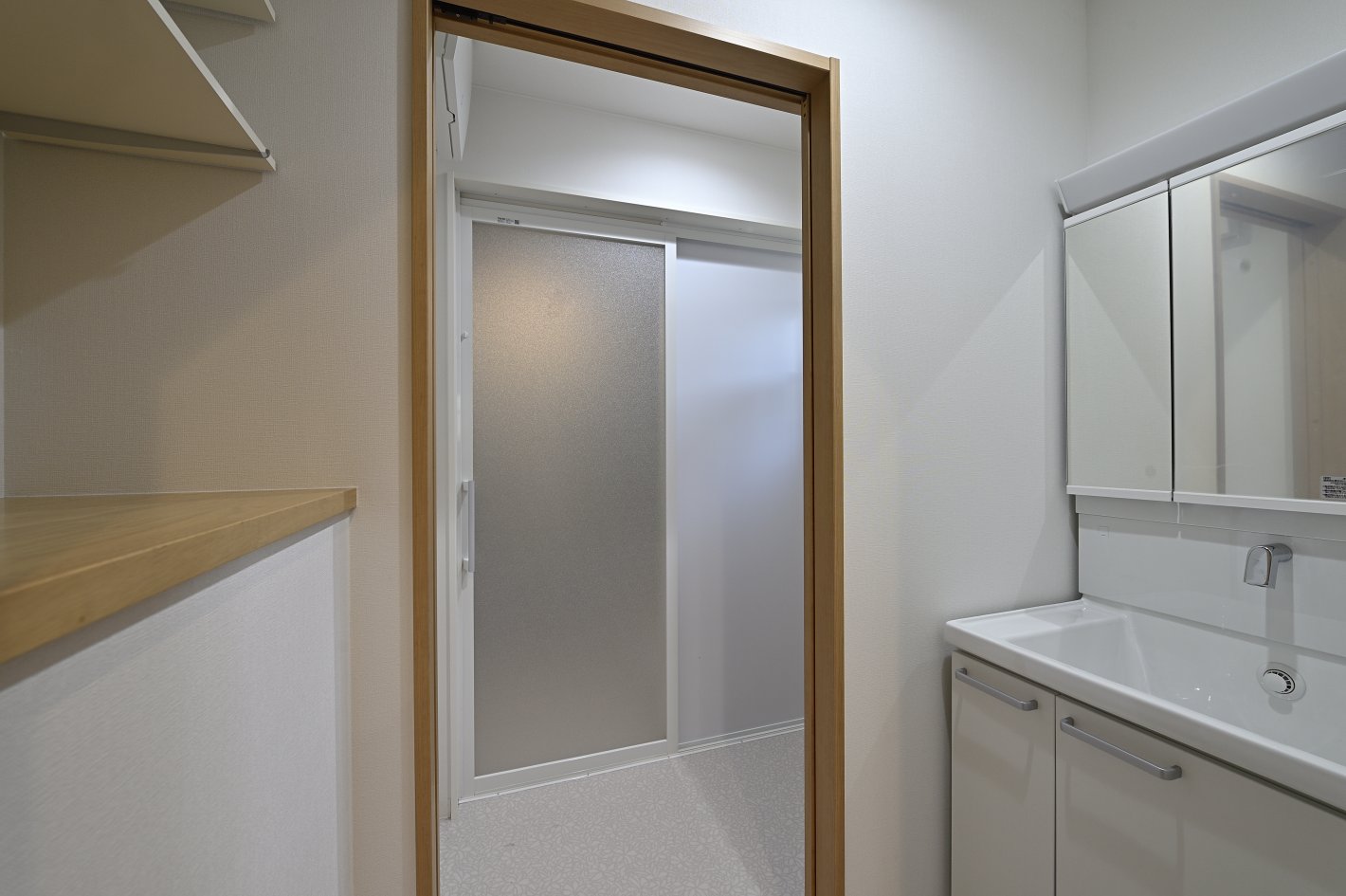 限られたスペースを最大限に活用し、洗面室側・キッチン側、高さを違えて両方向から収納を作りました。