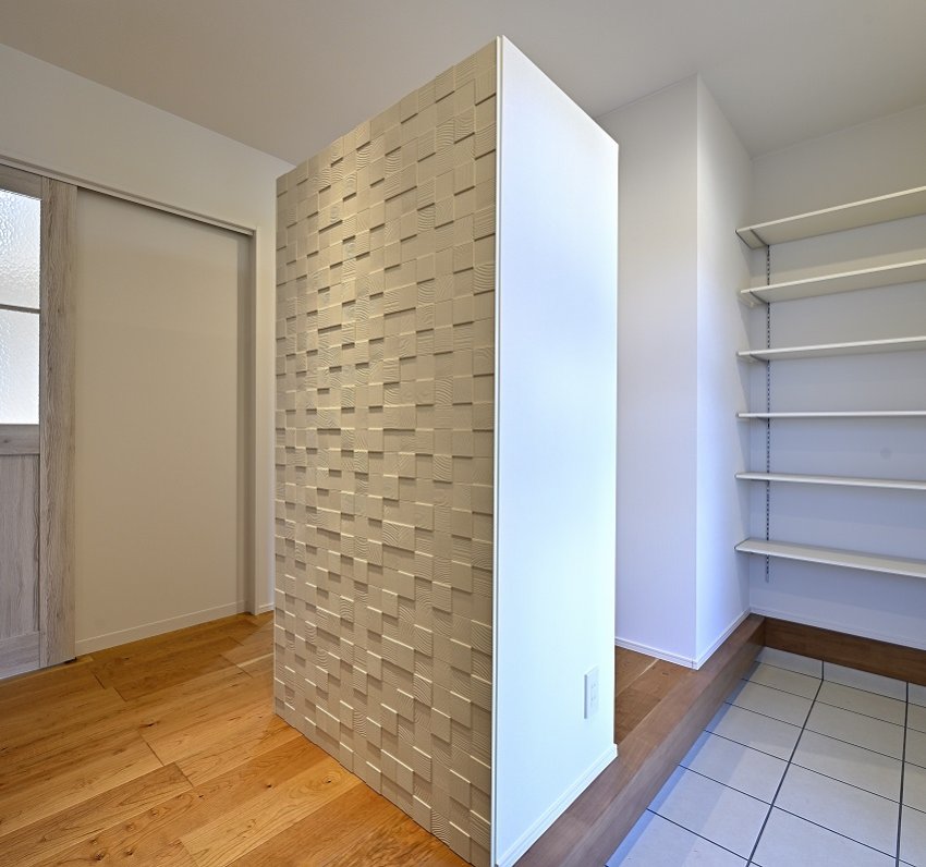 エコカラットを施した壁は高さを工夫する事で、玄関ホールの開放感にも拘りました。