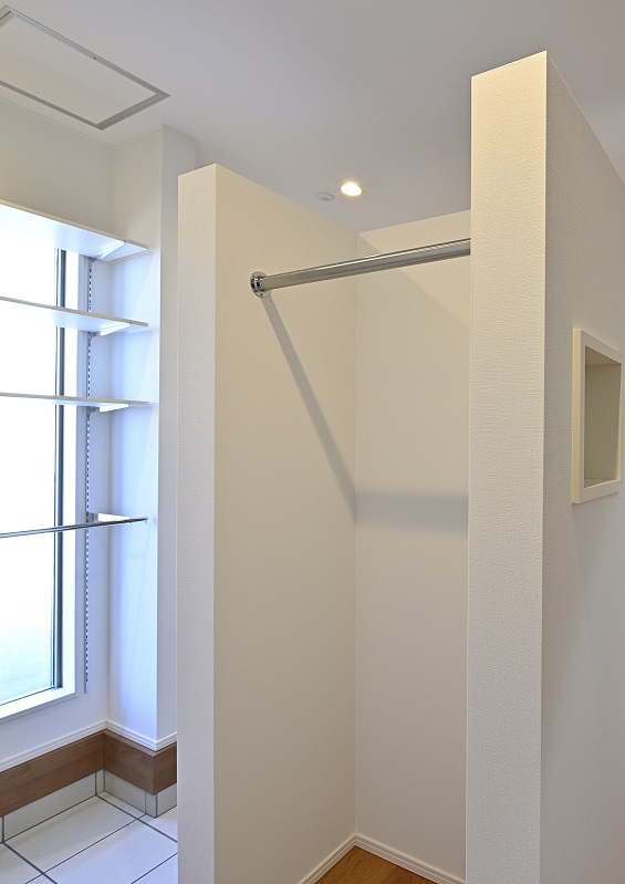 壁の後ろに回ると、洋服を掛ける事ができるクローゼットブースになっており、デザイン性と機能性、いいとこ取りの満足空間に仕上げました。 -