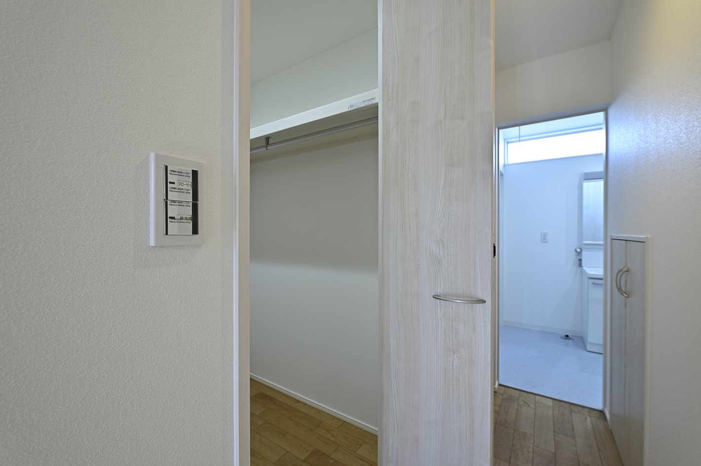 玄関クローク→ファミリークローク→洗面の真っすぐな動線が身支度・片付けの時短に繋がるようになっています。