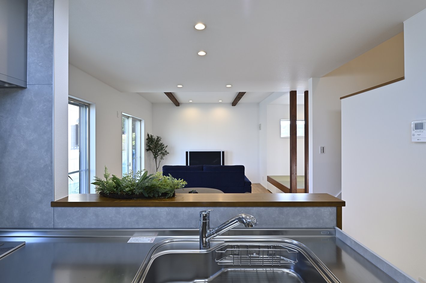 リビング上だけ天井高を上げて梁を出してあげることでアクセントになっています。