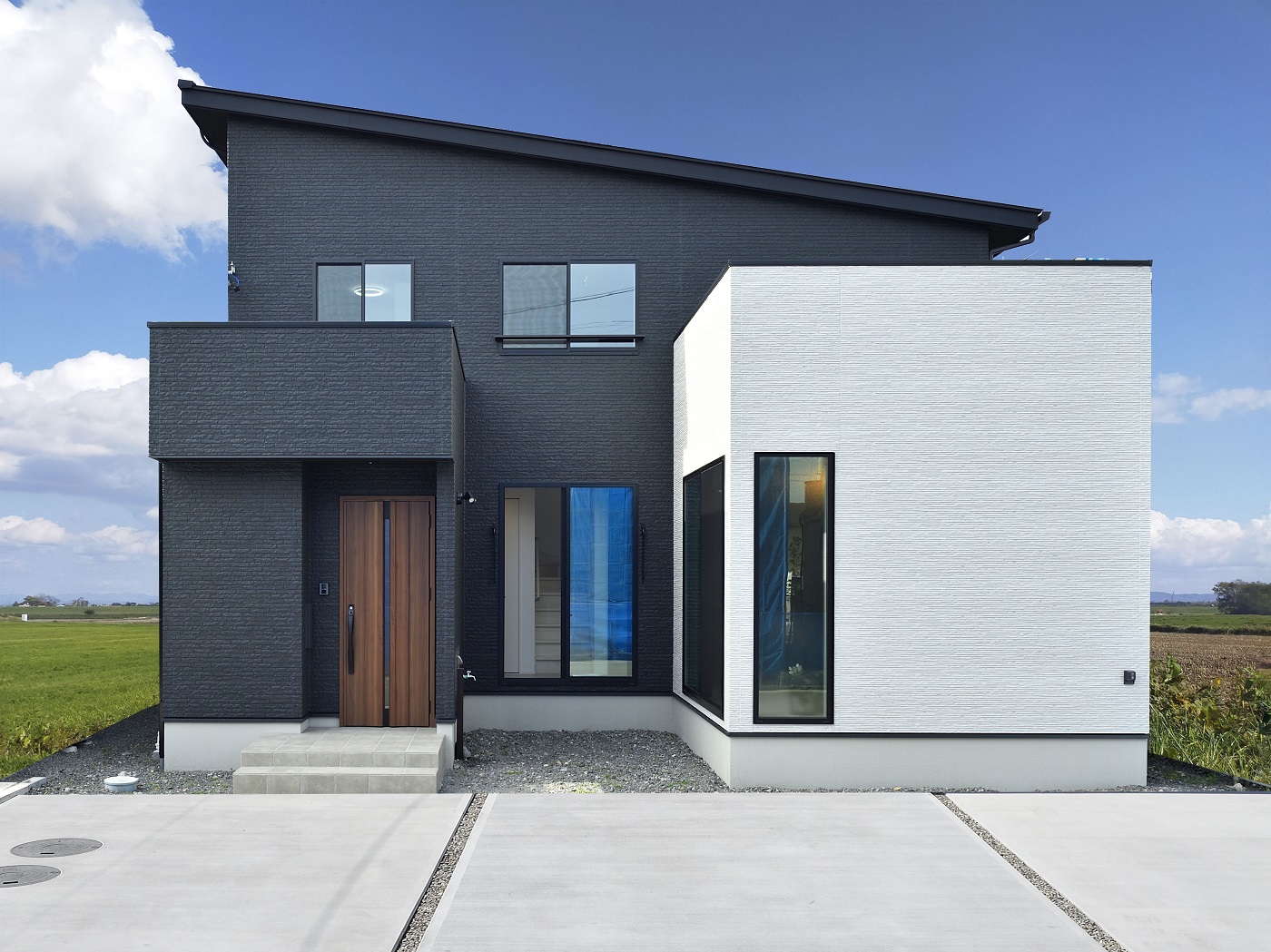 外観は片流れの大きな屋根と、高さの異なる2つのボックスが重なり合う構造となっており、そのデザインが、シャープでスタイリッシュな印象を際立たせています。