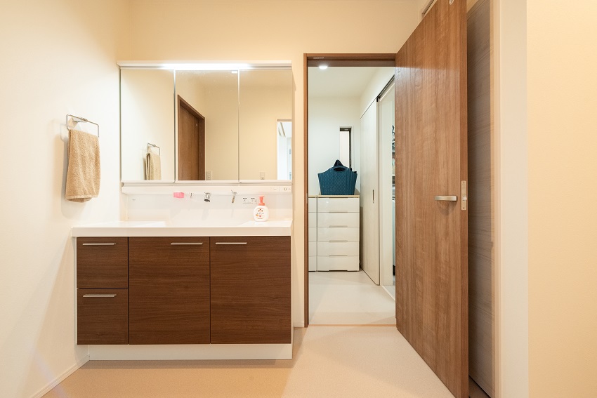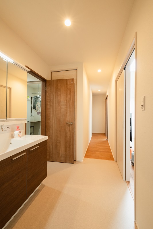 一直線の洗濯動線に収納力と周遊性を組み合わせ、身支度や片付けもスムーズに行えます。