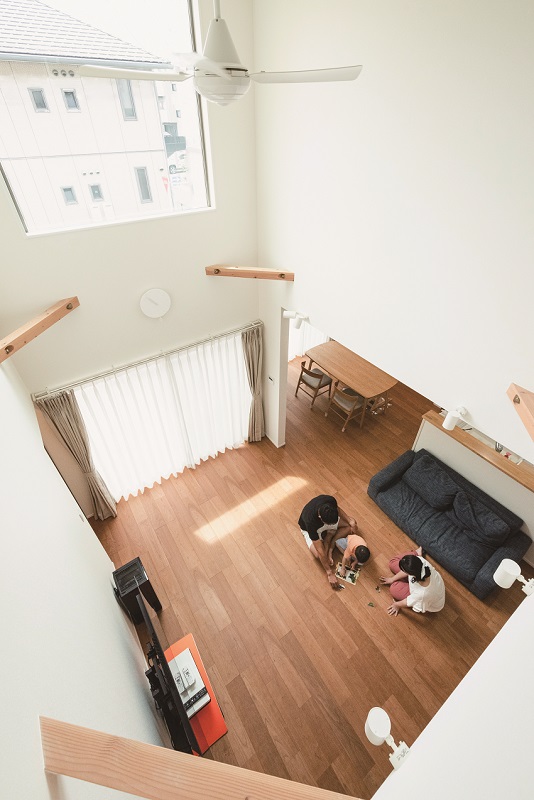 大きな吹き抜けと幅を広くした1階の窓からたっぷりの光がさしこみ、どこにいても心地がいいです。