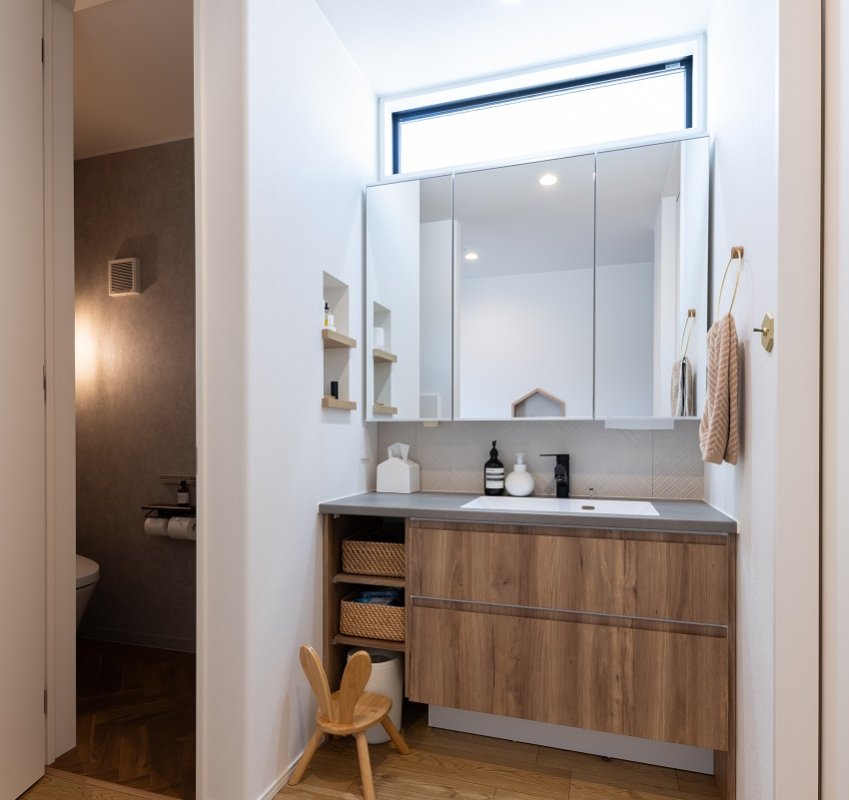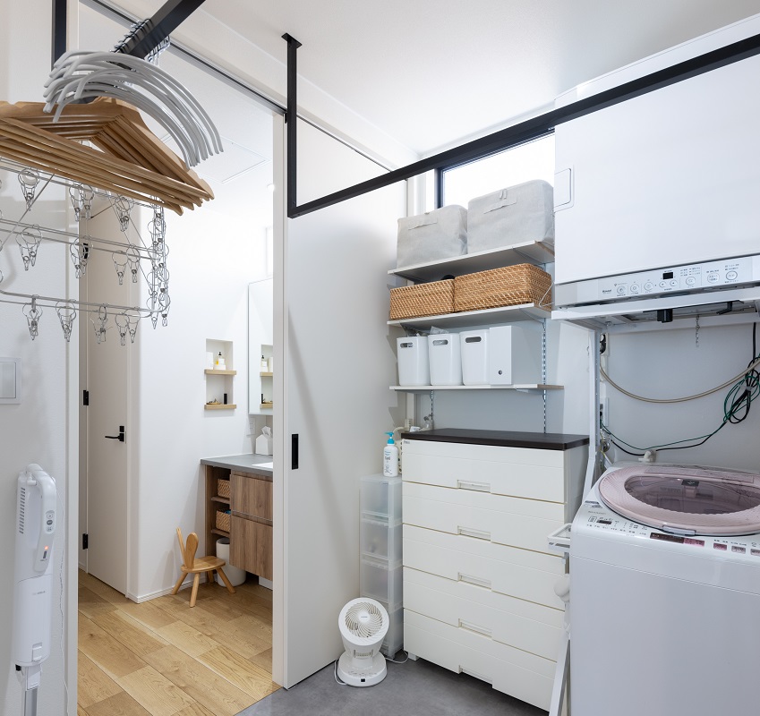 水廻りは家事効率があがるよう、回遊できる間取りにしました。