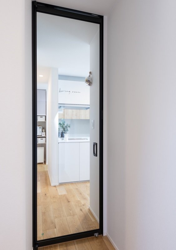 リビングへ続く透明なハイドアはこだわりの一つです。