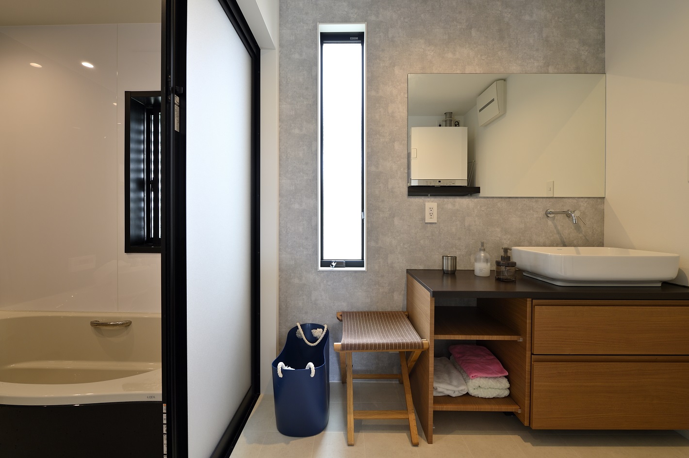 家族が二人並んでも使えるお洒落で実用的な造作風洗面化粧台。