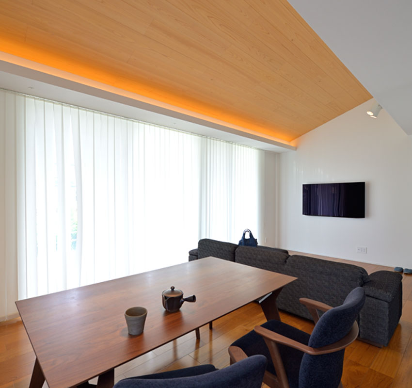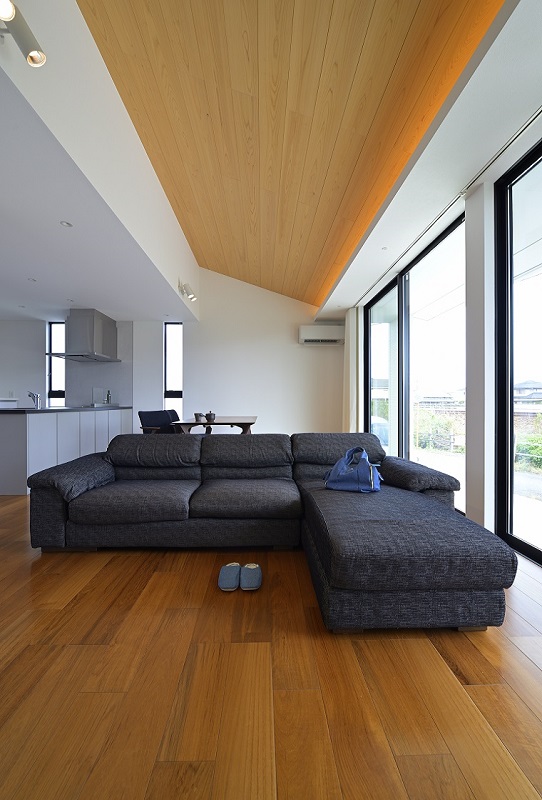 ご夫婦で考えた地元の木材を使った勾配天井は木の香りで癒し効果も抜群です。