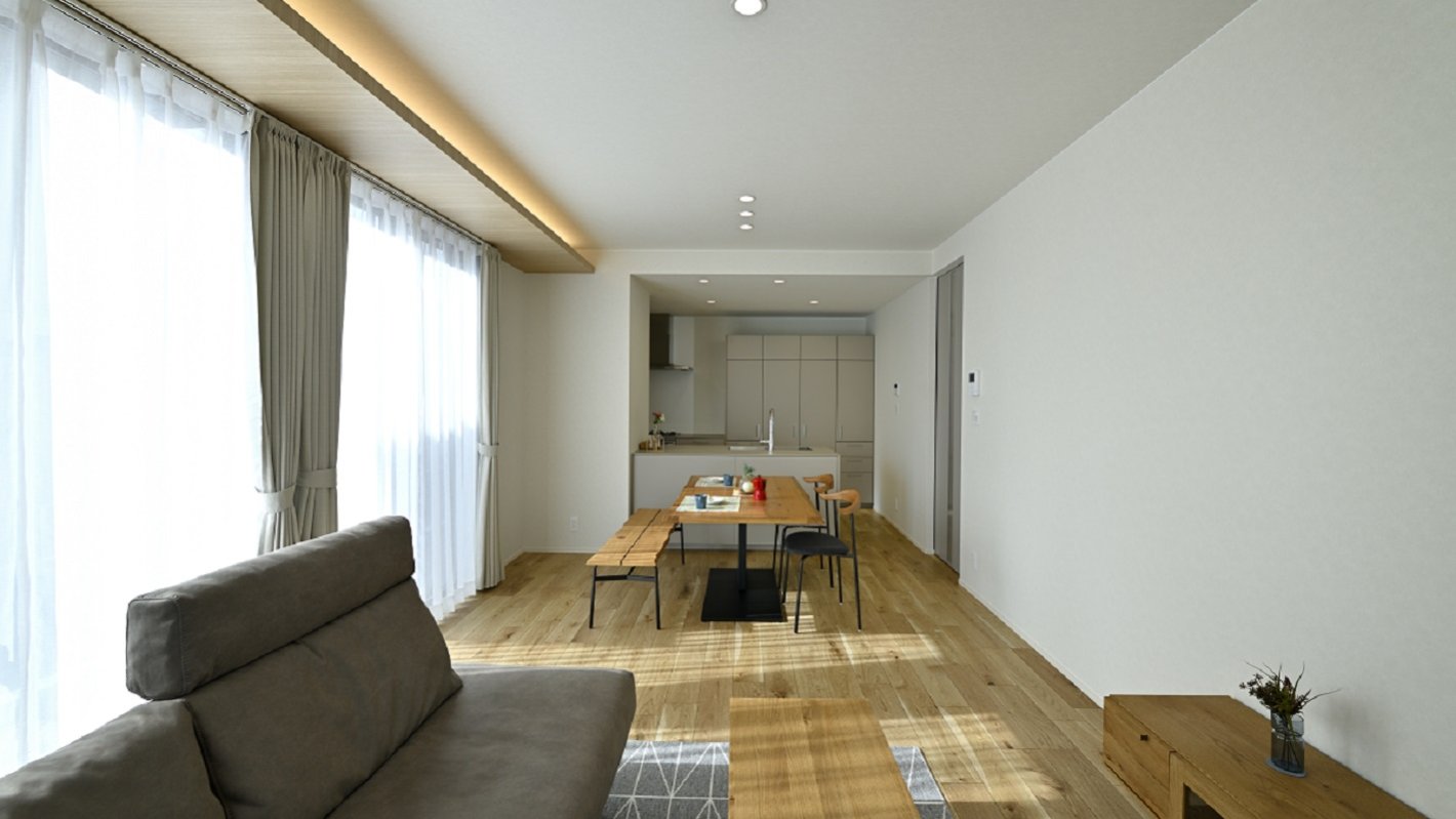 リビングの東側、南側の天井は間接照明によって暖かい光で照らされます。 -