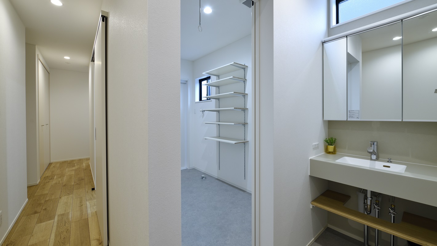 3帖と広い洗面脱衣室に加え、洗面化粧台が廊下に設置されているためより広くお使いいただけます。