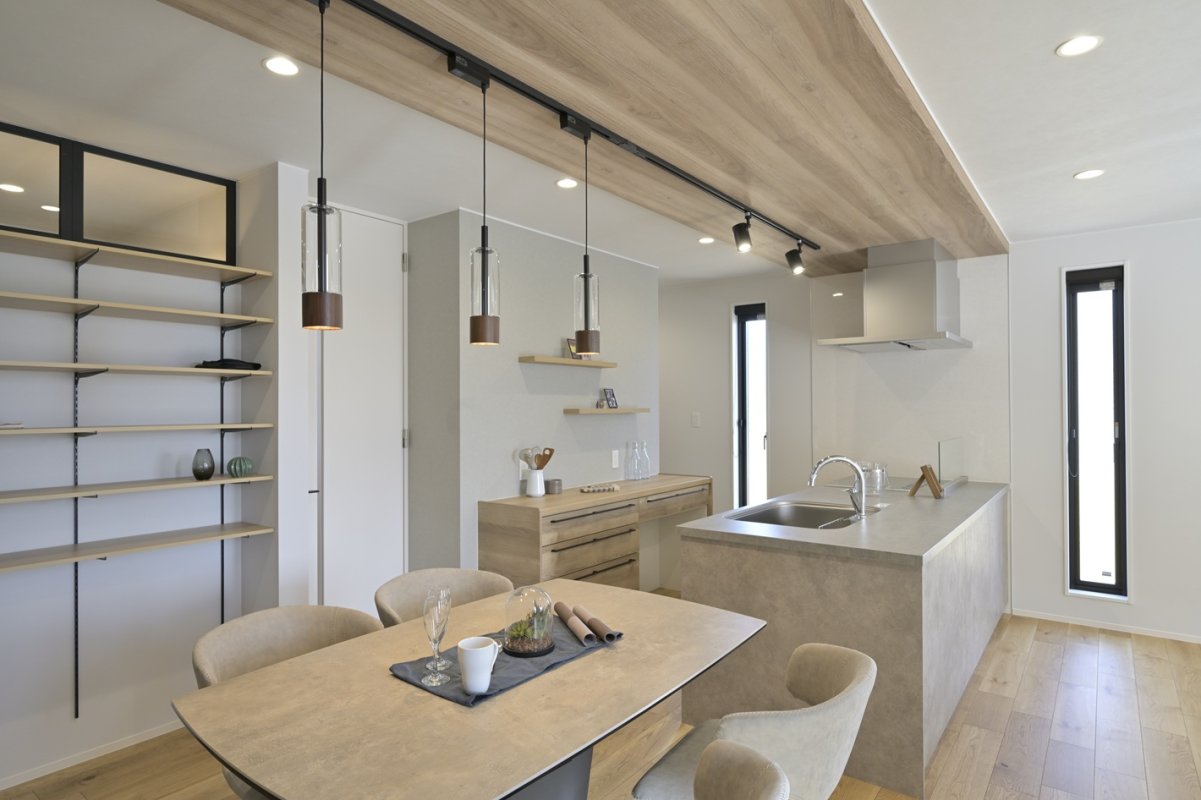 木目の下がり天井が空間のリズムを整え、キッチンへと連続させることで心地よい一体感を生みます。