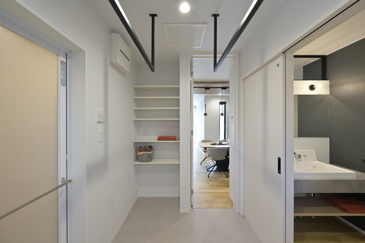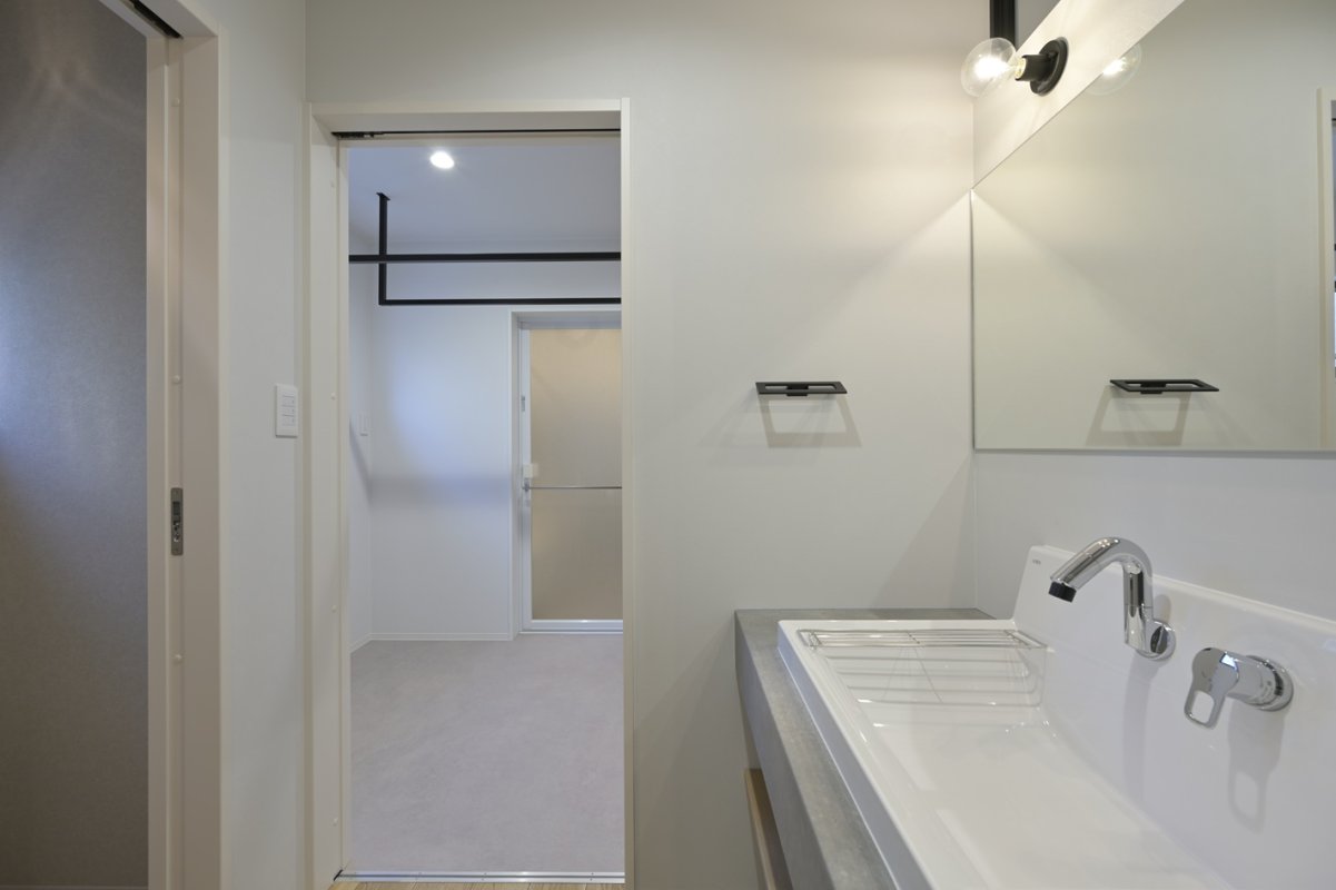 大きな鏡と水平ラインが美しい造作風の洗面。廊下側に洗面を設けることで、入浴や洗濯と分離して使え、朝の支度がスムーズになります。