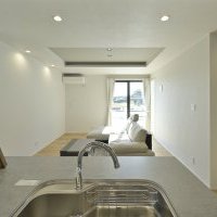 22帖のLDKは天井を一段高く設え、間接照明のやわらかな光が空間に奥行きと落ち着きを与えます。